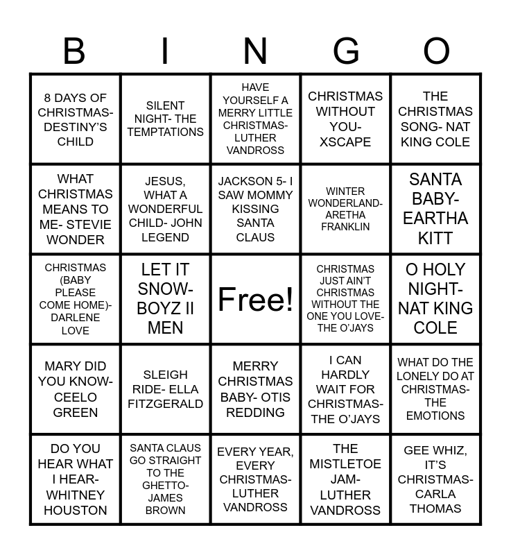 This bingo card has a free space and 42 words: THIS CHRISTMAS- DONNY HATHAWAY, JACKSON 5- I SAW MOMMY KISSING SANTA CLAUS, SOMEDAY AT CHRISTMAS- STEVIE WONDER, SLEIGH RIDE- ELLA FITZGERALD, THE MISTLETOE JAM- LUTHER VANDROSS, WHAT DO THE LONELY DO AT CHRISTMAS- THE EMOTIONS, GEE WHIZ, IT’S CHRISTMAS- CARLA THOMAS, RUDOLPH THE RED-NOSED REINDEER- THE TEMPTAIONS, HAVE YOURSELF A MERRY LITTLE CHRISTMAS- LUTHER VANDROSS, MERRY CHRISTMAS BABY- OTIS REDDING, O HOLY NIGHT- NAT KING COLE, SANTA BABY- EARTHA KITT, LET IT SNOW- BOYZ II MEN, THE CHRISTMAS SONG- NAT KING COLE, SANTA CLAUS IS COMING TO TOWN- JACKSON 5, I CAN HARDLY WAIT FOR CHRISTMAS- THE O’JAYS, THE MISTLETOE JAM- LUTHER VANDROSS, CHRISTMAS (BABY PLEASE COME HOME)- DARLENE LOVE, ALL I WANT FOR CHRISTMAS IS YOU- MARIAH CAREY, SILENT NIGHT- THE TEMPTATIONS, WHAT CHRISTMAS MEANS TO ME- STEVIE WONDER, GIVE LOVE ON CHRISTMAS DAY- JOHNNY GILL, SLEIGH RIDE- TLC, 8 DAYS OF CHRISTMAS- DESTINY’S CHILD, O’ COME ALL YE FAITHFUL- LUTHER VANDROSS, I WANT TO COME HOME FOR CHRISTMAS- MARVIN GAYE, WINTER WONDERLAND- ARETHA FRANKLIN, EMMANUEL- NORMAN HUTCHINS, GROWN UP CHRISTMAS LIST- MONICA, JOY TO THE WORLD- WHITNEY HOUSTON, CAROL OF BELLS- DESTINY’S CHILD, MARY DID YOU KNOW- CEELO GREEN, JESUS, WHAT A WONDERFUL CHILD- JOHN LEGEND, EVERY YEAR, EVERY CHRISTMAS- LUTHER VANDROSS, HARK THE HERALD ANGELS SING- MARY MARY, DO YOU HEAR WHAT I HEAR- WHITNEY HOUSTON, SANTA CLAUS GO STRAIGHT TO THE GHETTO- JAMES BROWN, CHRISTMAS JUST AIN’T CHRISTMAS WITHOUT THE ONE YOU LOVE- THE O’JAYS, SOUL HOLIDAYS- SOUNDS OF BLACKNESS, THE FIRST NOEL- CECE WINANS, CHRISTMAS WITHOUT YOU- XSCAPE and MY FAVORITE THINGS- LUTHER VANDROSS.