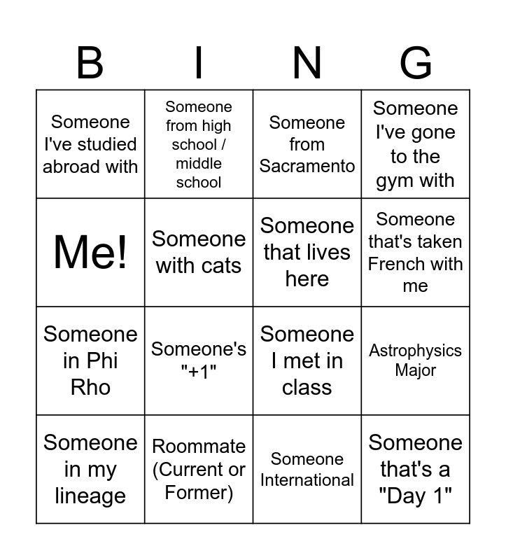 This bingo card has 16 words: Roommate (Current or Former), Astrophysics Major, Someone from Sacramento, Someone I've studied abroad with, Someone in Phi Rho, Someone from high school / middle school, Someone I met in class, Someone International, Me!, Someone with cats, Someone in my lineage, Someone I've gone to the gym with, Someone's "+1", Someone that's taken French with me, Someone that lives here and Someone that's a "Day 1".