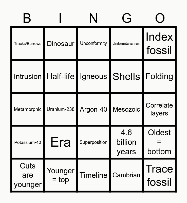 This bingo card has 35 words: Relative age, Absolute age, Radiometric dating, Half‑life, Superposition, Uniformitarianism, Intrusion, Fault, Igneous, Sedimentary, Metamorphic, Index fossil, Fossil, Extinct, Tracks/Burrows, Mesozoic, Cambrian, Uranium‑238, Potassium‑40, Argon‑40, 4.6 billion years, Cuts are younger, Oldest = bottom, Younger = top, Unconformity, Folding, Trace fossil, Bones, Shells, Correlate layers, Dating igneous, Timeline, Era, Dinosaur and Index = wide distribution.