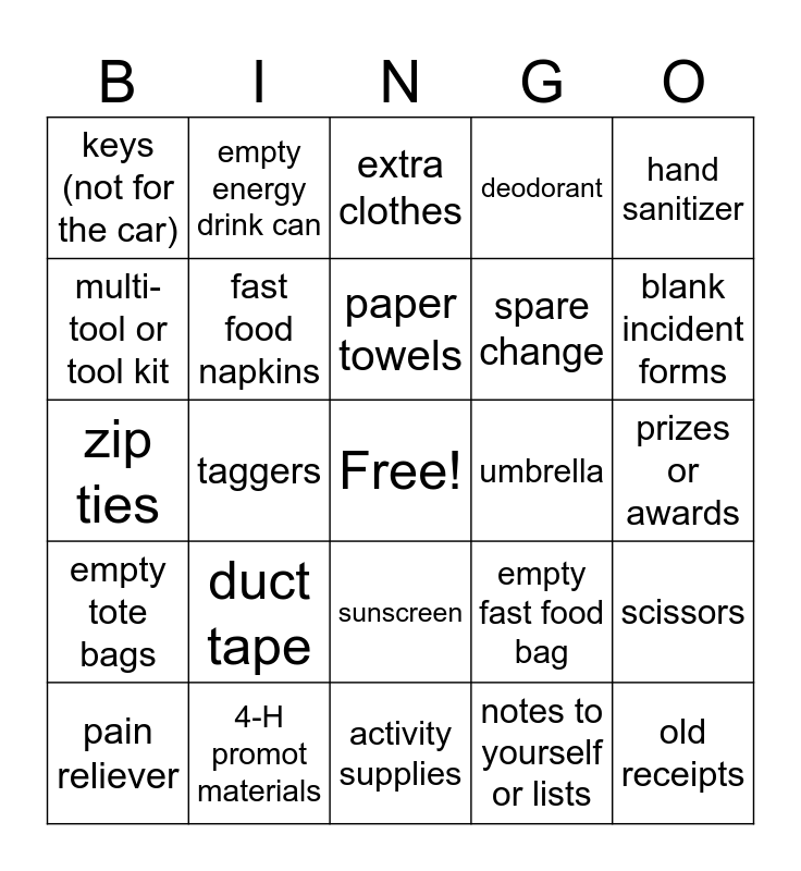 This bingo card has a free space and 33 words: project books, extra shoes, taggers, at least 4 pens, empty tote bags, fast food napkins, hand sanitizer, pain reliever, empty energy drink can, snacks, paper towels, extra clothes, first aid kit, extra hair ties, umbrella, blank incident forms, 4-H promot materials, zip ties, duct tape, empty fast food bag, sunscreen, sunglasses, keys (not for the car), prizes or awards, activity supplies, old receipts, deodorant, spare change, multi-tool or tool kit, scissors, post-it notes, notes to yourself or lists and chapstick.