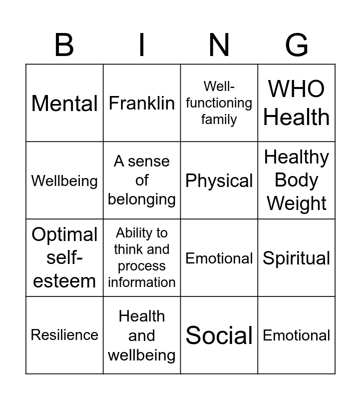 This bingo card has 17 words: Social, Resilience, Well-functioning family, Mental, Ability to think and process information, WHO Health, Spiritual, Physical, Healthy Body Weight, A sense of belonging, Health and wellbeing, Emotional, Wellbeing, Franklin, Optimal self-esteem, Peace and hope and Emotional.