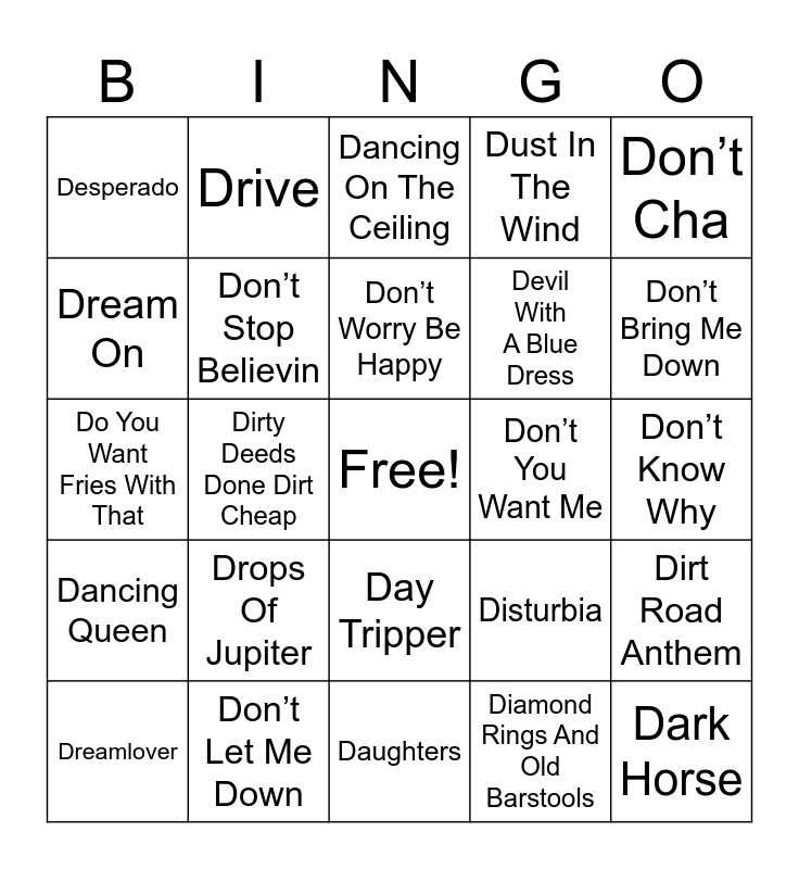 This bingo card has a free space and 46 words: Dance The Night Away, Dark Horse, Dancing In The Dark, Daughters, Drops Of Jupiter, Drunk On A Plane, Drive, Drink In My Hand, Dream On, Don’t, Don’t Stop Believin, Dust In The Wind, Dirt Road Anthem, Disturbia, Drink On It, Drinking Class, Don’t Worry Be Happy, Don’t You Want Me, Double Vision, Don’t Cha, Dirty Deeds Done Dirt Cheap, Diamond Rings And Old Barstools, Desperado, Devil With A Blue Dress, Donna, Don’t Bring Me Down, Dreamlover, Drift Away, Day Tripper, Dancing Queen, Do You Really Want To Hurt Me, (Don’t Fear) The Reaper, Don’t You(Forget About Me), Down Under, Dreams, Don’t Let Me Down, Don’t Know Why, Don’t Go Breaking My Heart, Do You Believe In Love, Dirty Diana, Danger Zone, Dancing On The Ceiling, Do You Want Fries With That, Day Drinking, Don’t Speak and Dancing With Myself.