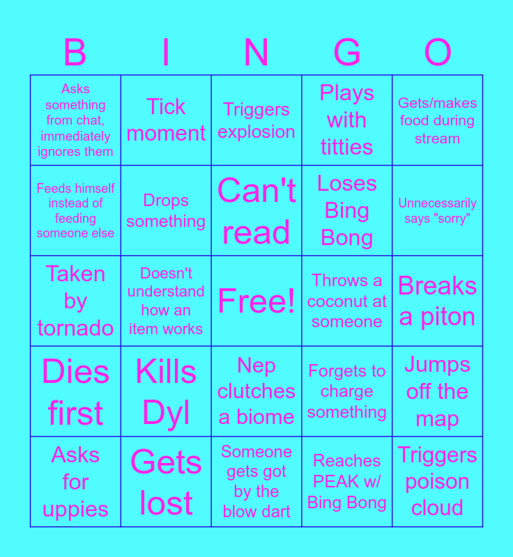 This bingo card has a free space and 36 words: Sings/Raps, Vocal stims a TikTok, "SIT ON IT!", Drops something, Forgets to charge something, Dies first, Can't read, "Fun fact...", Gets/makes food during stream, Blames chat for something, Doesn't understand how an item works, Plays with titties, Forget to help someone up, Throws a coconut at someone, Unnecessarily says "sorry", Asks something from chat, immediately ignores them, Bathroom break for more than 5 minutes, Kills Dyl, Triggers poison cloud, Triggers explosion, Breaks a piton, Jumps off the map, Gets lost, Asks for uppies, Someone gets got by the blow dart, Tick moment, Taken by tornado, Makes it to PEAK, Loses Bing Bong, Feeds himself instead of feeding someone else, Cannon mishap, Scout Master encounter, Reaches PEAK w/ Bing Bong, Nep clutches a biome, Goes way too far ahead of everyone and Gets left behind.