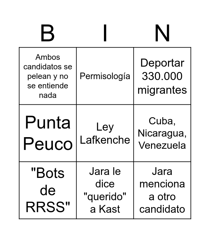 This bingo card has a free space and 26 words: Kast se queda callado ante pregunta, Kast se enoja con periodista, Jara le dice "querido" a Kast, Muñeca bielorrusa, Jara menciona a otro candidato, Ambos candidatos se pelean y no se entiende nada, Cuba, Nicaragua, Venezuela, Permisología, "Narcoterrorismo", Periodista pierde la mesura, Jara se queda callada por pregunta, "Ex-ministra Jara", Jara dice que Kast no hizo nada en el Congreso, Kast hace emotes con la cara, Jara habla como ruda *le sale cringe*, Prometen bajar sueldos a políticos (otra vez), Punta Peuco, Chile necesita un Bukele..., Deportar 330.000 migrantes, Retiros de AFP, Casas de apuestas, Reducción de impuesto a las empresas, Proponen pena de muerte, Colusión de farmacias, "Bots de RRSS" and Acusación Const. contra ministro de Energía..