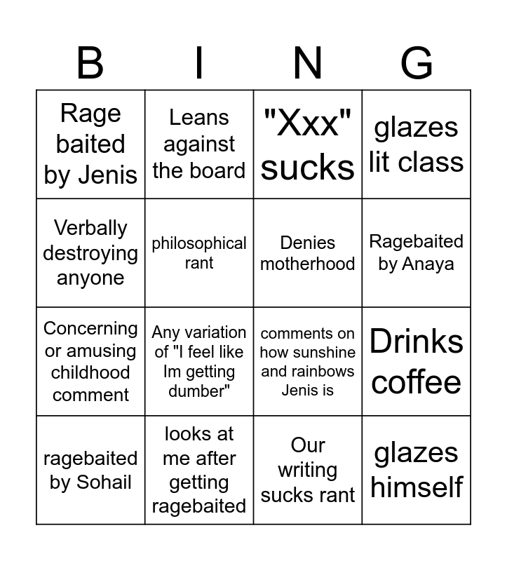 This bingo card has 16 words: looks at me after getting ragebaited, Drinks coffee, "Xxx" sucks, Rage baited by Jenis, Concerning or amusing childhood comment, Leans against the board, comments on how sunshine and rainbows Jenis is, Our writing sucks rant, Verbally destroying anyone, philosophical rant, ragebaited by Sohail, glazes lit class, Any variation of "I feel like Im getting dumber", Ragebaited by Anaya, Denies motherhood and glazes himself.