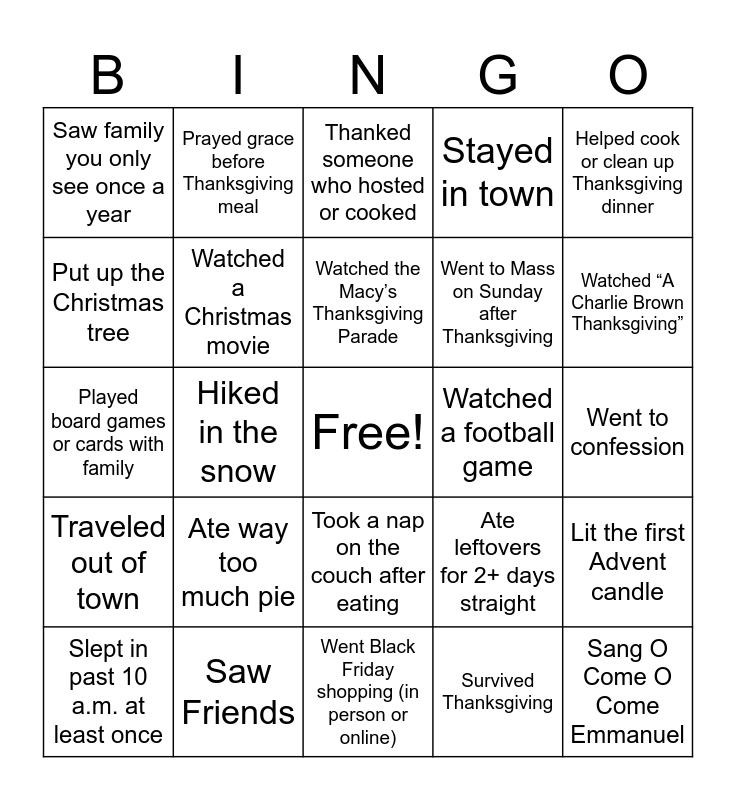 This bingo card has a free space and 25 words: Ate way too much pie, Went Black Friday shopping (in person or online), Watched the Macy’s Thanksgiving Parade, Slept in past 10 a.m. at least once, Helped cook or clean up Thanksgiving dinner, Saw family you only see once a year, Put up the Christmas tree, Prayed grace before Thanksgiving meal, Watched a football game, Took a nap on the couch after eating, Went to Mass on Sunday after Thanksgiving, Played board games or cards with family, Ate leftovers for 2+ days straight, Lit the first Advent candle, Watched a Christmas movie, Took a family photo, Went to confession, Thanked someone who hosted or cooked, Watched “A Charlie Brown Thanksgiving”, Hiked in the snow, Sang O Come O Come Emmanuel, Saw Friends, Traveled out of town, Stayed in town and Survived Thanksgiving.