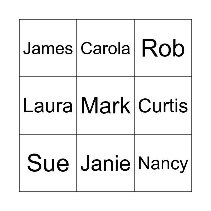 This bingo card has a free space and 20 words: Meigan, Svet, Rob, Ritisha, Deb, Nancy, Jackie, James, Cindy, Carola, Ninan, Susan, Curtis, Shabnam, Sue, Karen, Janie, Laura, Aven and Kate.