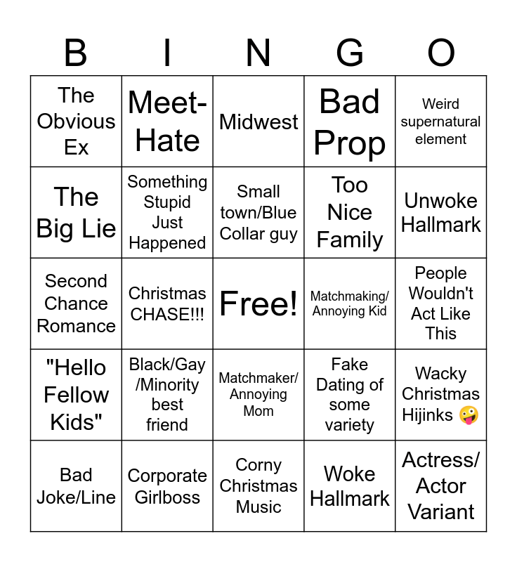 This bingo card has a free space and 24 words: Black/Gay /Minority best friend, Corporate Girlboss, Small town/Blue Collar guy, Bad Joke/Line, Weird supernatural element, The Obvious Ex, The Big Lie, Meet-Hate, Matchmaking/ Annoying Kid, Matchmaker/ Annoying Mom, Too Nice Family, Second Chance Romance, Fake Dating of some variety, Wacky Christmas Hijinks 🤪, Something Stupid Just Happened, Woke Hallmark, People Wouldn't Act Like This, Midwest, Unwoke Hallmark, Christmas CHASE!!!, Actress/ Actor Variant, "Hello Fellow Kids", Bad Prop and Corny Christmas Music.