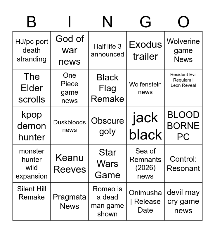 This bingo card has a free space and 24 words: Keanu Reeves, Pragmata News, Black Flag Remake, Silent Hill Remake, Wolverine game News, HJ/pc port death stranding, The Elder scrolls, God of war news, jack black, Star Wars Game, Wolfenstein news, kpop demon hunter, Sea of Remnants (2026) news, Control: Resonant, One Piece game news, Onimusha | Release Date, BLOOD BORNE PC, Half life 3 announced, Resident Evil Requiem | Leon Reveal, Duskbloods news, devil may cry game news, monster hunter wild expansion, Exodus trailer and Romeo is a dead man game shown.