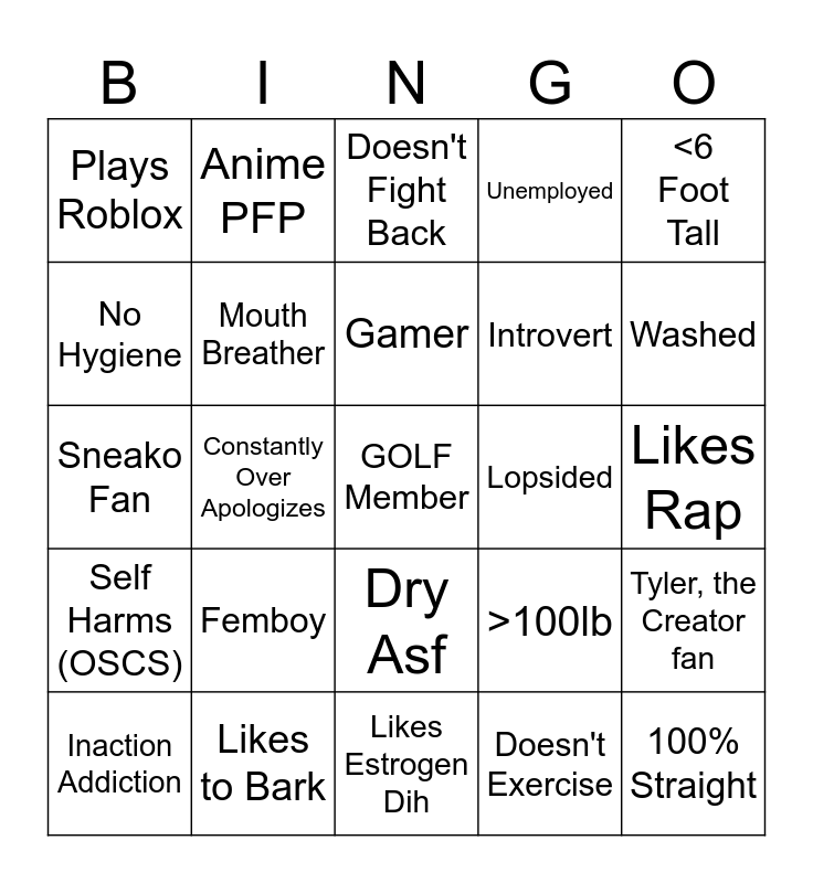 This bingo card has a free space and 24 words: Femboy, Likes to Bark, Gamer, Inaction Addiction, <6 Foot Tall, Plays Roblox, No Hygiene, Anime PFP, Lopsided, Dry Asf, Introvert, Sneako Fan, >100lb, Tyler, the Creator fan, Mouth Breather, Doesn't Exercise, Likes Rap, Doesn't Fight Back, Washed, Constantly Over Apologizes, 100% Straight, Self Harms (OSCS), Unemployed and Likes Estrogen Dih.