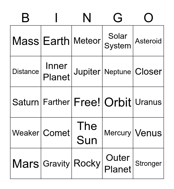 This bingo card has a free space and 24 words: Comet, Gravity, Jupiter, Mars, Asteroid, Mass, Distance, Earth, Orbit, The Sun, Neptune, Saturn, Mercury, Venus, Inner Planet, Outer Planet, Uranus, Meteor, Closer, Farther, Stronger, Weaker, Solar System and Rocky.