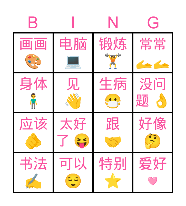 This bingo card has 16 words: 可以😌, 好像 🤔, 锻炼🏋️, 画画🎨, 应该 🫵, 电脑💻, 跟 🤝, 特别 ⭐️, 身体🧍♂️, 见 👋, 书法 ✍️, 常常 🫴🫴, 太好了 😝, 没问题 👌, 生病😷 and 爱好🩷.