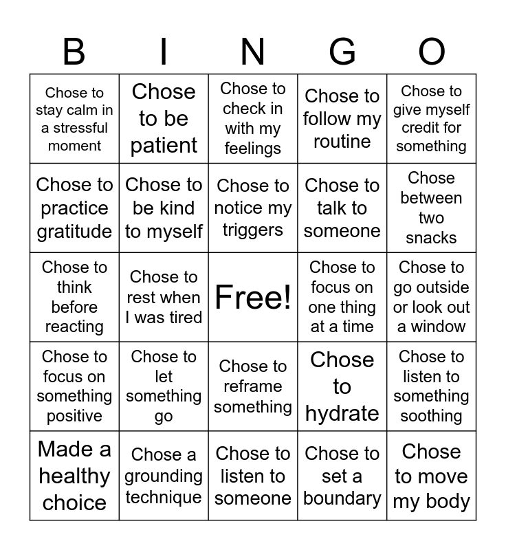 This bingo card has a free space and 29 words: Made a healthy choice, Chose to attend group, Chose to rest when I was tired, Asked for help when needed, Chose to stay calm in a stressful moment, Chose to check in with my feelings, Chose to be kind to myself, Chose to let something go, Chose to focus on one thing at a time, Chose a grounding technique, Chose to go outside or look out a window, Chose to move my body, Chose to listen to someone, Chose to set a boundary, Chose between two snacks, Chose to challenge a negative thought, Chose to reframe something, Chose to focus on something positive, Chose to give myself credit for something, Chose to think before reacting, Chose to hydrate, Chose to try something new today, Chose to talk to someone, Chose to practice gratitude, Chose to follow my routine, Chose to be patient, Chose to listen to something soothing, Chose to notice my triggers and Chose to check my assumptions.