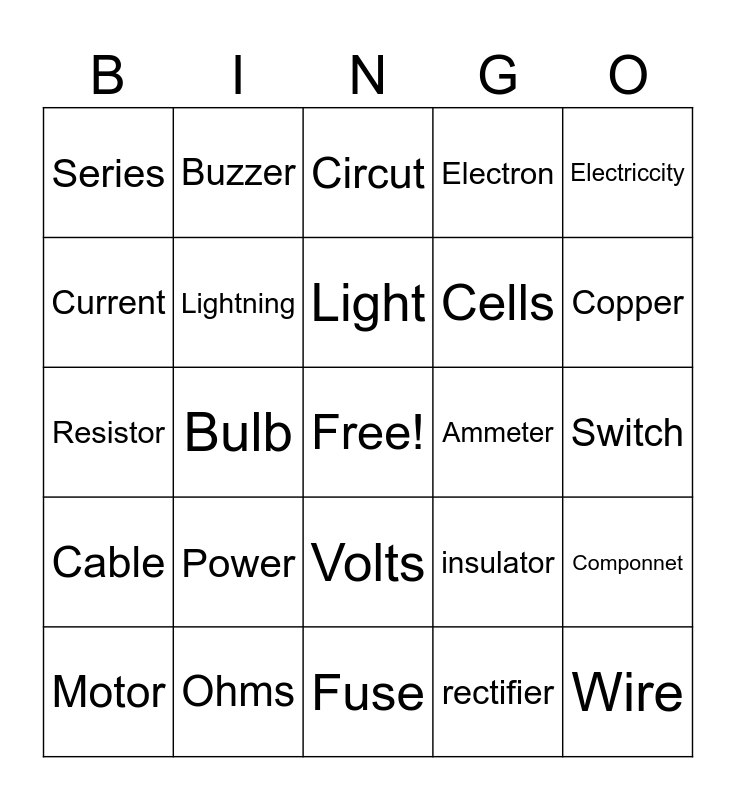 This bingo card has a free space and 24 words: Power, Ohms, Light, Motor, Electriccity, Series, Current, Buzzer, Ammeter, Volts, Cells, Resistor, insulator, Componnet, Lightning, rectifier, Switch, Circut, Copper, Bulb, Wire, Cable, Electron and Fuse.