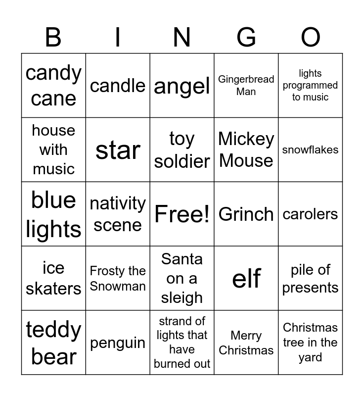 This bingo card has a free space and 24 words: Frosty the Snowman, penguin, toy soldier, teddy bear, lights programmed to music, candy cane, house with music, candle, Grinch, Santa on a sleigh, Mickey Mouse, blue lights, elf, pile of presents, star, Merry Christmas, carolers, angel, snowflakes, nativity scene, Christmas tree in the yard, ice skaters, Gingerbread Man and strand of lights that have burned out.