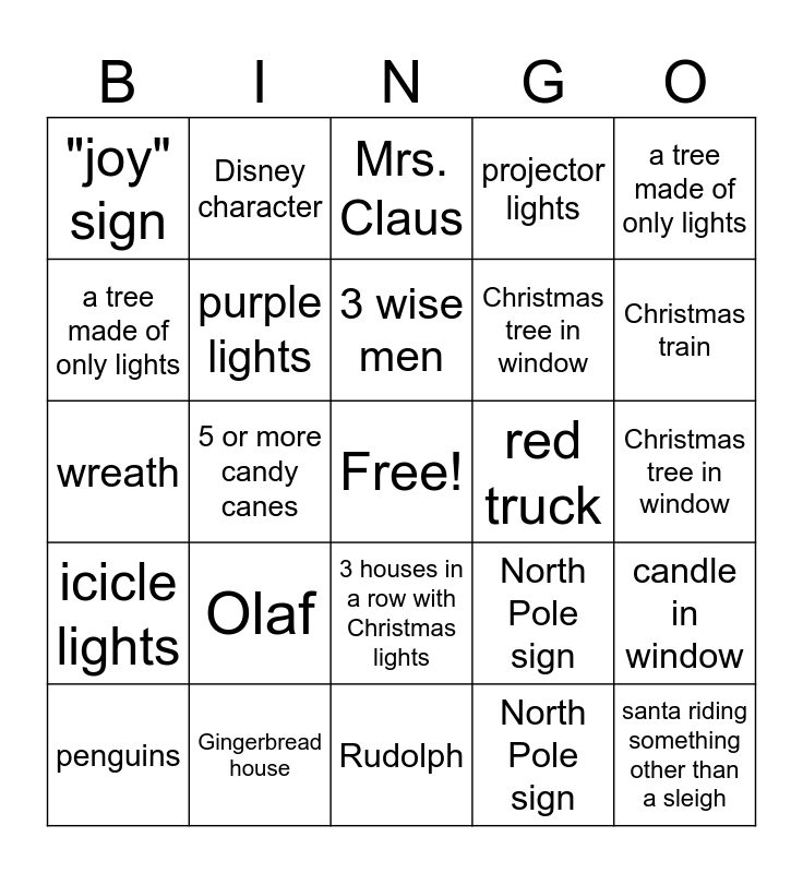 This bingo card has a free space and 28 words: candle in window, tree trunk wrapped in lights, Christmas tree in window, North Pole sign, a tree made of only lights, Mrs. Claus, Disney character, icicle lights, red truck, penguins, wreath, projector lights, Gingerbread house, Rudolph, Christmas train, set of 3 reindeer, Olaf, purple lights, 3 wise men, 3 houses in a row with Christmas lights, "joy" sign, snow globe, santa riding something other than a sleigh, 5 or more candy canes, Christmas tree in window, North Pole sign, a tree made of only lights and wreath.