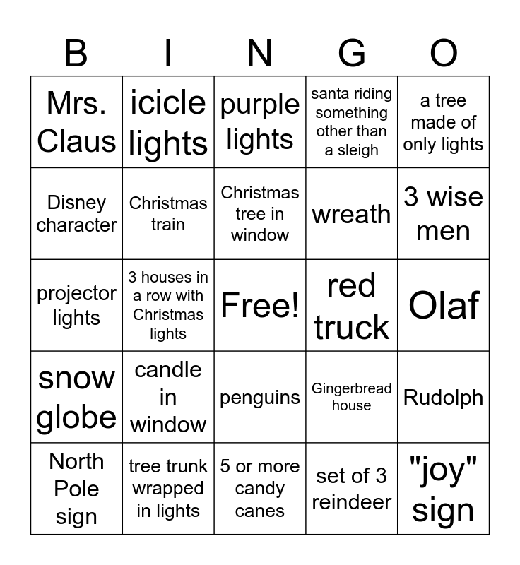 This bingo card has a free space and 24 words: candle in window, tree trunk wrapped in lights, Christmas tree in window, North Pole sign, a tree made of only lights, Mrs. Claus, Disney character, icicle lights, red truck, penguins, wreath, projector lights, Gingerbread house, Rudolph, Christmas train, set of 3 reindeer, Olaf, purple lights, 3 wise men, 3 houses in a row with Christmas lights, "joy" sign, snow globe, santa riding something other than a sleigh and 5 or more candy canes.