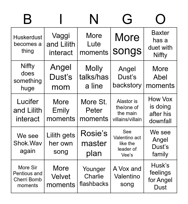 This bingo card has 25 words: Lilith gets her own song, Younger Charlie flashbacks, Molly talks/has a line, More Sir Pentious and Cherri Bomb moments, Baxter has a duet with Niffty, Huskerdust becomes a thing, Niffty does something huge, Vaggi and Lilith interact, Alastor is the/one of the main villains/villain, Rosie’s master plan, Angel Dust’s backstory, Lucifer and Lilith interact, See Valentino act like the leader of Vee’s, We see Angel Dust’s family, Angel Dust’s mom, Husk’s feelings for Angel Dust, How Vox is doing after his downfall, More Lute moments, More Abel moments, More Emily moments, More St. Peter moments, More Velvet moments, We see Shok.Wav again, More songs and A Vox and Valentino song.