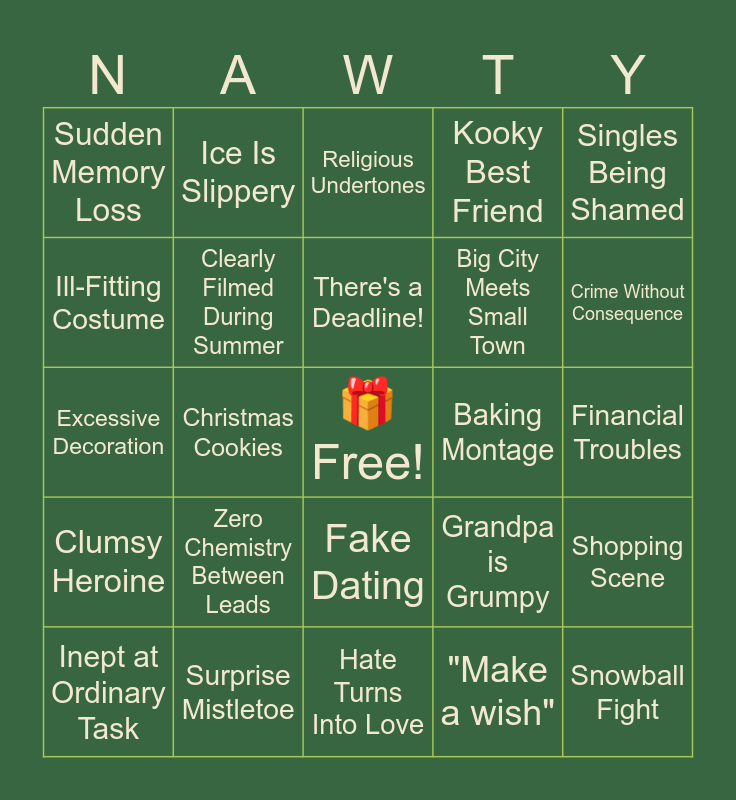 This bingo card has a free space and 29 words: Inept at Ordinary Task, Outfit Faux Pa, Christmas Cookies, Last Minute Party, Sudden Memory Loss, Religious Undertones, Clearly Filmed During Summer, Zero Chemistry Between Leads, Baking Montage, Surprise Mistletoe, Financial Troubles, Snowball Fight, Hate Turns Into Love, "Make a wish", Crime Without Consequence, Woman Doing All The Labor, Fake Dating, Clumsy Heroine, Singles Being Shamed, Excessive Decoration, Grandpa is Grumpy, Attempt at Diversity, Big City Meets Small Town, Ill-Fitting Costume, Kooky Best Friend, Ice Is Slippery, Shopping Scene, There's a Deadline! and Perfectly Timed Snowfall.