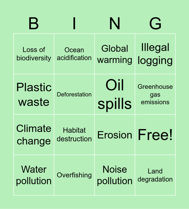 This bingo card has 20 words: Free!, Deforestation, Global warming, Air pollution, Water pollution, Plastic waste, Overfishing, Loss of biodiversity, Climate change, Ocean acidification, Habitat destruction, Erosion, Deforestation, Land degradation, Oil spills, Toxic chemicals, Greenhouse gas emissions, Illegal logging, Noise pollution and Light pollution.