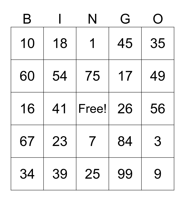 This bingo card has a free space and 24 words: 23, 39, 75, 34, 35, 10, 60, 18, 26, 7, 17, 16, 84, 3, 54, 99, 56, 1, 49, 41, 9, 67, 45 and 25.