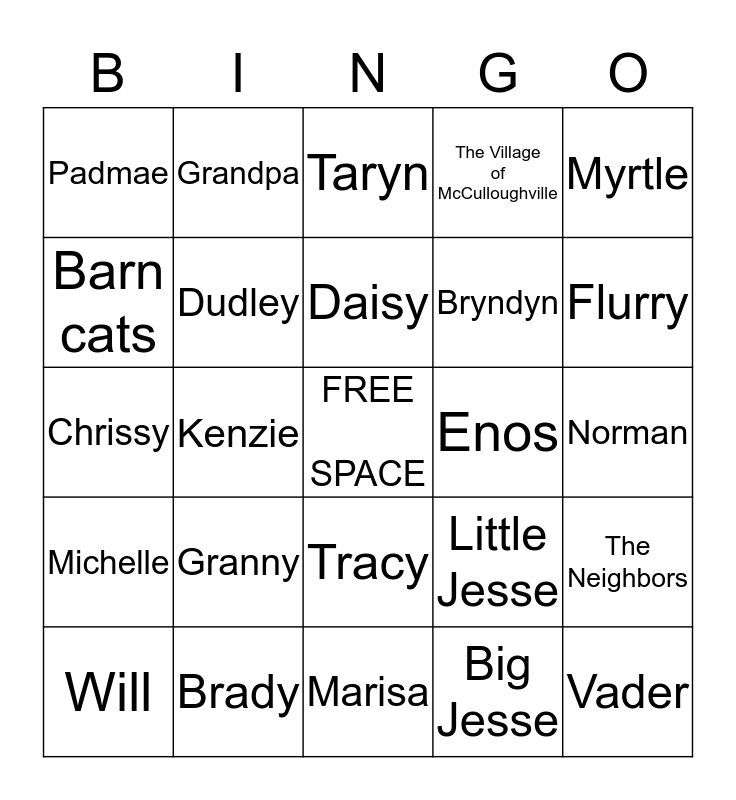 This bingo card has a free space and 24 words: Granny, Brady, Daisy, Will, Myrtle, Padmae, Barn cats, Grandpa, Enos, Tracy, Bryndyn, Chrissy, Little Jesse, The Neighbors, Dudley, Big Jesse, Norman, Taryn, Flurry, Kenzie, Vader, Michelle, The Village of McCulloughville and Marisa.