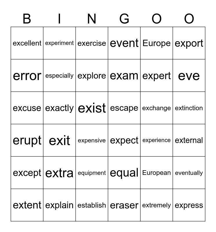 This bingo card has 36 words: equal, equipment, eraser, error, erupt, escape, especially, establish, Europe, European, eve, event, eventually, exactly, exam, excellent, except, exchange, excuse, exercise, exist, exit, expect, expensive, experience, experiment, expert, explain, explore, export, express, extent, external, extinction, extra and extremely.