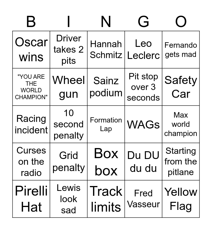 This bingo card has a free space and 44 words: Giant Ferrari Flag, Yellow Flag, Medium Tire, Pirelli Hat, Mattia sighting, Fred Vasseur, Hannah Schmitz, Papaya rules, Fernando gets mad, Lewis look sad, Leo Leclerc, WAGs, Box box, Grid penalty, 5 second penalty, Track limits, Crash, Racing incident, Virtual Safety Car, Safety Car, Driver takes 2 pits, Max wins, Lando wins, Oscar wins, "We are checking", Max world champion, Antonelli podium, The Dutch National Anthem, Du DU du du, Curses on the radio, Red flag, Starting from the pitlane, Stroll crashes, DNF, 10 second penalty, Kick Sauber scores points, Mohammed Ben Sulayem, Valtteri Bottas sighting, Sainz podium, "YOU ARE THE WORLD CHAMPION", Pit stop over 3 seconds, Pit stop under 2 seconds, Wheel gun and Soft tire.