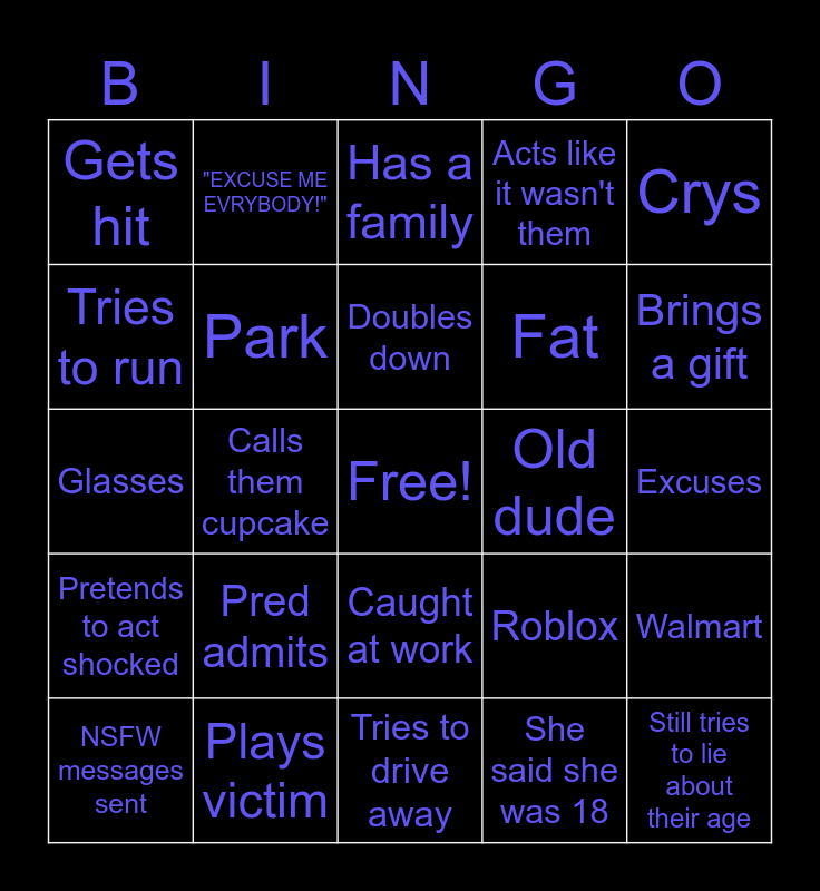 This bingo card has a free space and 24 words: Pred admits, Plays victim, Doubles down, NSFW messages sent, Crys, Gets hit, Tries to run, "EXCUSE ME EVRYBODY!", Old dude, Caught at work, Fat, Glasses, Roblox, Walmart, Park, She said she was 18, Excuses, Has a family, Brings a gift, Calls them cupcake, Still tries to lie about their age, Pretends to act shocked, Acts like it wasn't them and Tries to drive away.