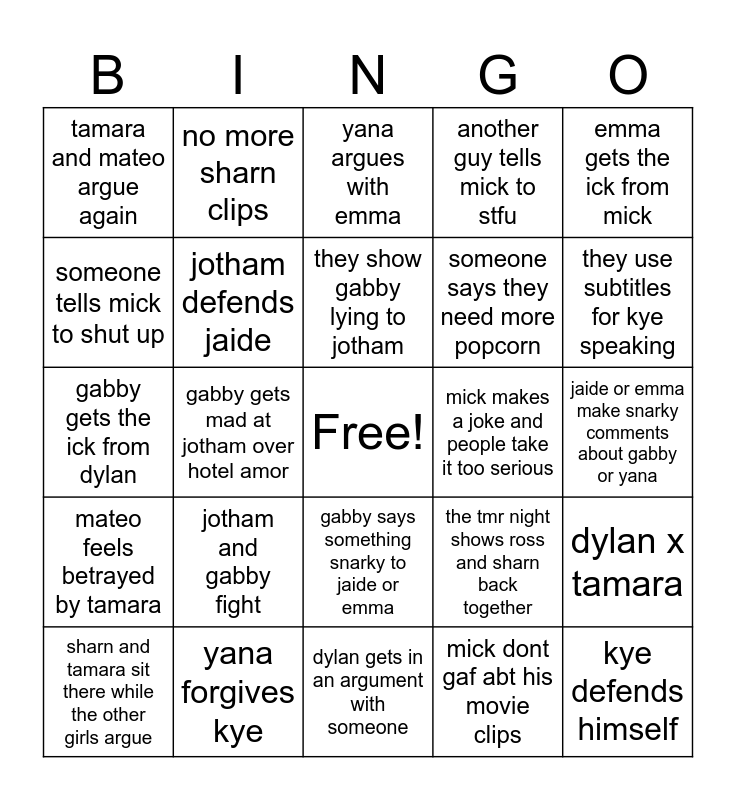 This bingo card has a free space and 24 words: jotham and gabby fight, yana forgives kye, they show gabby lying to jotham, sharn and tamara sit there while the other girls argue, emma gets the ick from mick, tamara and mateo argue again, someone tells mick to shut up, no more sharn clips, mick makes a joke and people take it too serious, gabby says something snarky to jaide or emma, someone says they need more popcorn, gabby gets the ick from dylan, the tmr night shows ross and sharn back together, dylan x tamara, jotham defends jaide, mick dont gaf abt his movie clips, jaide or emma make snarky comments about gabby or yana, yana argues with emma, they use subtitles for kye speaking, gabby gets mad at jotham over hotel amor, kye defends himself, mateo feels betrayed by tamara, another guy tells mick to stfu and dylan gets in an argument with someone.