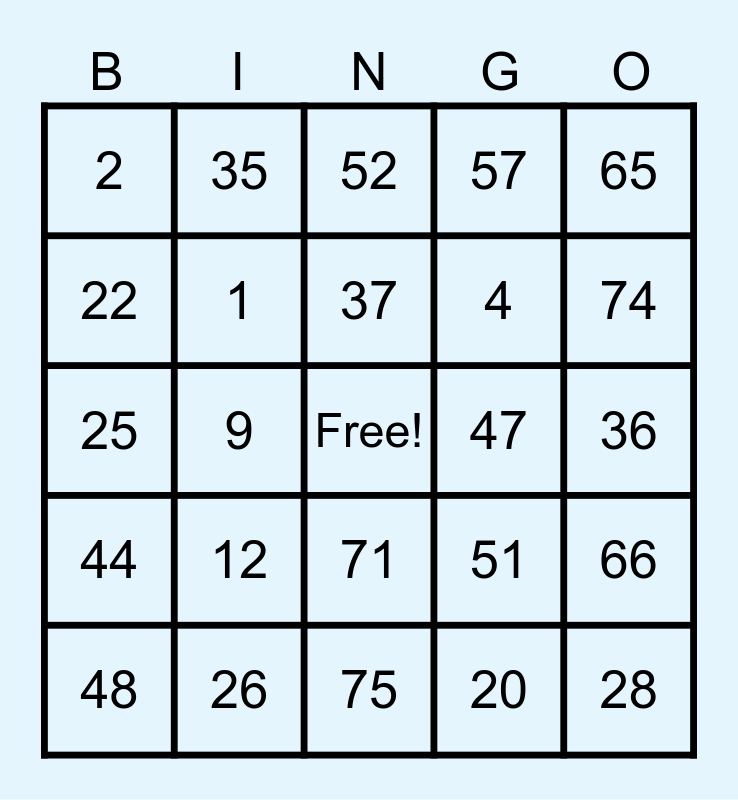 This bingo card has a free space and 24 words: 12, 26, 37, 48, 65, 2, 22, 35, 47, 71, 4, 25, 51, 66, 1, 20, 36, 52, 74, 9, 28, 44, 57 and 75.