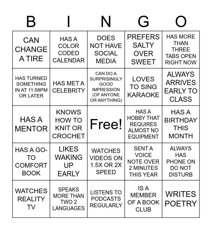 This bingo card has a free space and 24 words: LIKES WAKING UP EARLY, SPEAKS MORE THAN TWO 2 LANGUAGES, CAN DO A SURPRISINGLY GOOD IMPRESSION (OF ANYONE OR ANYTHING), WATCHES REALITY TV, HAS MORE THAN THREE TABS OPEN RIGHT NOW, CAN CHANGE A TIRE, HAS TURNED SOMETHING IN AT 11:58PM OR LATER, HAS A COLOR CODED CALENDAR, HAS A HOBBY THAT REQUIRES ALMOST NO EQUIPMENT, WATCHES VIDEOS ON 1.5X OR 2X SPEED, LOVES TO SING KARAOKE, HAS A MENTOR, SENT A VOICE NOTE OVER 2 MINUTES THIS YEAR, ALWAYS HAS PHONE ON DO NOT DISTURB, HAS MET A CELEBRITY, IS A MEMBER OF A BOOK CLUB, HAS A BIRTHDAY THIS MONTH, DOES NOT HAVE SOCIAL MEDIA, ALWAYS ARRIVES EARLY TO CLASS, KNOWS HOW TO KNIT OR CROCHET, WRITES POETRY, HAS A GO-TO COMFORT BOOK, PREFERS SALTY OVER SWEET and LISTENS TO PODCASTS REGULARLY.