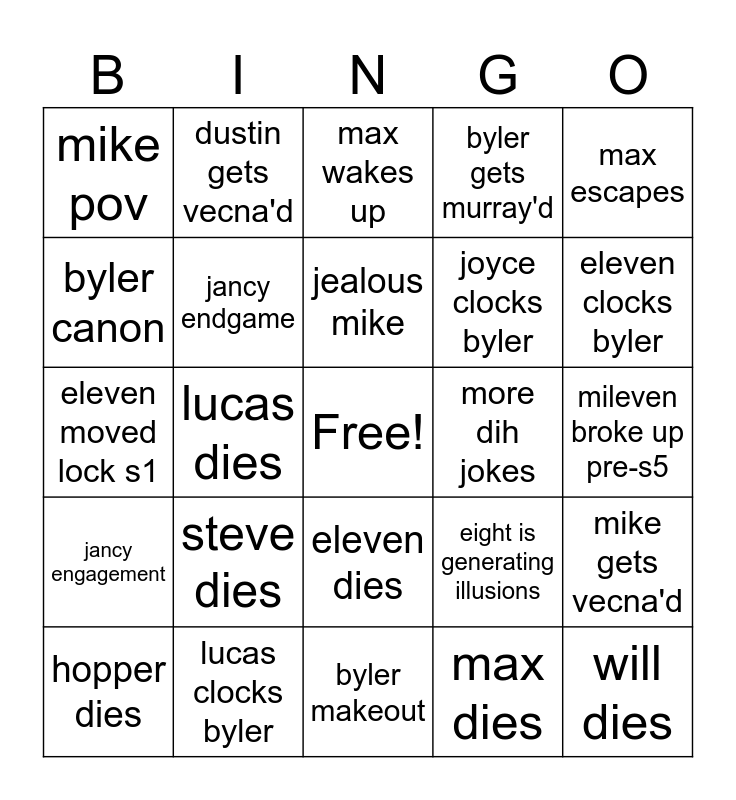 This bingo card has a free space and 24 words: steve dies, lucas clocks byler, jealous mike, hopper dies, max escapes, mike pov, byler canon, dustin gets vecna'd, more dih jokes, eleven dies, joyce clocks byler, eleven moved lock s1, eight is generating illusions, mike gets vecna'd, jancy endgame, max dies, mileven broke up pre-s5, max wakes up, eleven clocks byler, lucas dies, will dies, jancy engagement, byler gets murray'd and byler makeout.