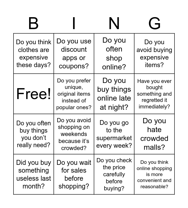 This bingo card has 16 words: Do you wait for sales before shopping?, Do you hate crowded malls?, Do you often shop online?, Do you think clothes are expensive these days?, Do you often buy things you don’t really need?, Do you use discount apps or coupons?, Do you go to the supermarket every week?, Do you check the price carefully before buying?, Free!, Do you prefer unique, original items instead of popular ones?, Did you buy something useless last month?, Do you avoid buying expensive items?, Do you avoid shopping on weekends because it’s crowded?, Have you ever bought something and regretted it immediately?, Do you buy things online late at night? and Do you think online shopping is more convenient and reasonable?.