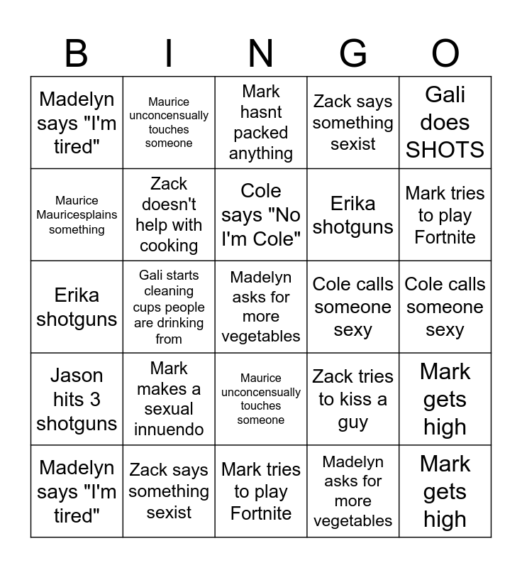 This bingo card has 50 words: Madelyn says "im tired", Madelyn asks for more vegetables, Jason laughs at a joke that isn't funny, Mark tries to play Fortnite, Mark makes a sexual innuendo, Mark hasnt packed anything, Maurice unconcensually touches someone, Maurice talks about multimatic, Maurice Mauricesplains something, Maurice makes a reference no one else gets, Zack doesn't help with cooking, Zack says something sexist, Mark gets high, Zack tries to kiss a guy, Zach says "like a lamb", Cole makes a pun, Cole says "No I'm Cole", Cole calls someone sexy, Cole says Deliverables, Gali does SHOTS, Gali starts cleaning cups people are drinking from, Madelyn asks for more vegetables, Madelyn says "I'm tired", Erika shotguns, Erika calls Zack Pookie, Mark gets high, Mark tries to play Fortnite, Mark makes a sexual innuendo, Mark hasnt packed anything, Maurice unconcensually touches someone, Maurice talks about multimatic, Maurice Mauricesplains something, Maurice makes a reference no one else gets, Zack doesn't help with cooking, Zack says something sexist, Zack tries to kiss a guy, Zach says "like a lamb", Cole makes a pun, Cole says "No I'm Cole", Cole calls someone sexy, Cole says Deliverables, Gali does SHOTS, Gali starts cleaning cups people are drinking from, Madelyn asks for more vegetables, Madelyn says "I'm tired", Erika shotguns, Erika calls Zack Pookie, J talk to Erica, Jason hits 3 shotguns and Jason laughs at a joke that isn't funny.