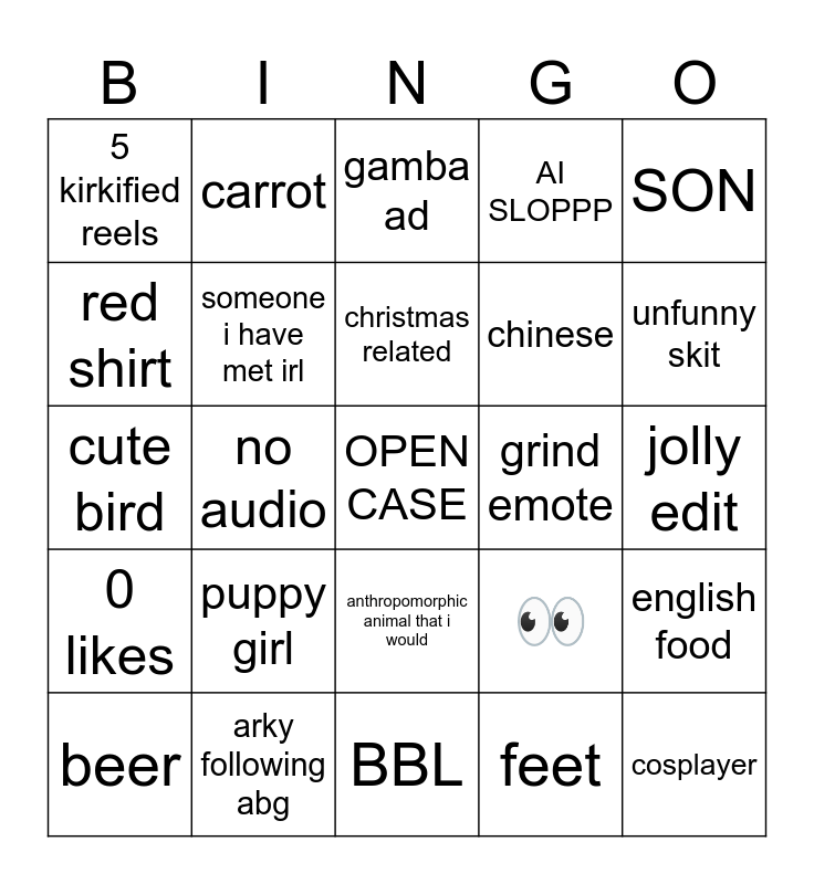 This bingo card has a free space and 24 words: puppy girl, arky following abg, christmas related, beer, SON, 5 kirkified reels, red shirt, carrot, grind emote, anthropomorphic animal that i would, chinese, cute bird, 👀, english food, someone i have met irl, feet, jolly edit, gamba ad, unfunny skit, no audio, cosplayer, 0 likes, AI SLOPPP and BBL.