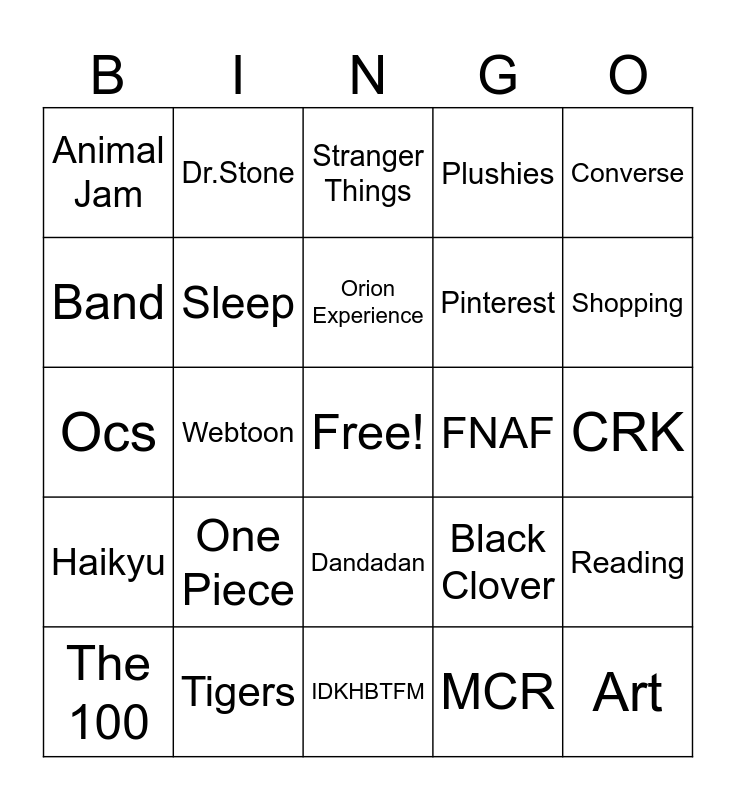 This bingo card has a free space and 24 words: One Piece, Tigers, Orion Experience, The 100, Converse, Animal Jam, Band, Dr.Stone, FNAF, Dandadan, Pinterest, Ocs, Black Clover, Reading, Sleep, MCR, CRK, Stranger Things, Shopping, Webtoon, Art, Haikyu, Plushies and IDKHBTFM.