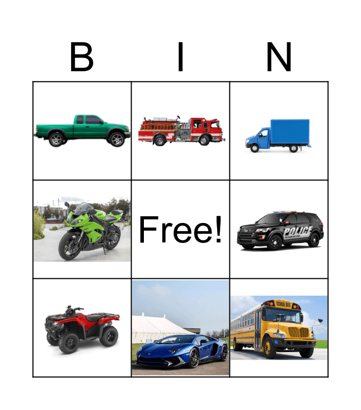 Vehicles | Porch Bingo | Bailingo | Vehicle Bingo | Vehicle Bingo