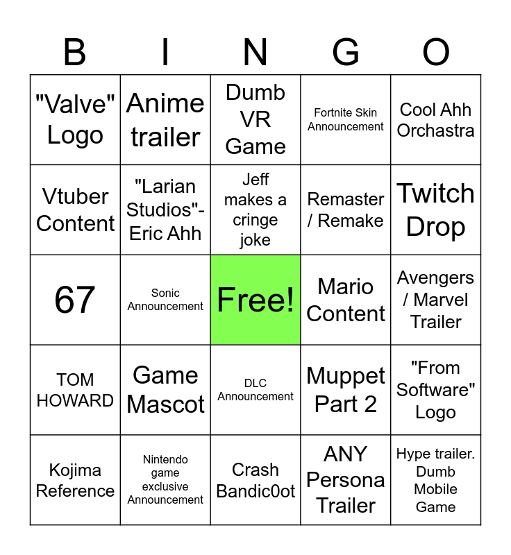 This bingo card has a free space and 24 words: Game Mascot, Nintendo game exclusive Announcement, Jeff makes a cringe joke, Kojima Reference, Cool Ahh Orchastra, "Valve" Logo, Vtuber Content, Anime trailer, Mario Content, DLC Announcement, Remaster / Remake, 67, Muppet Part 2, "From Software" Logo, "Larian Studios"-Eric Ahh, ANY Persona Trailer, Avengers / Marvel Trailer, Dumb VR Game, Twitch Drop, Sonic Announcement, Hype trailer. Dumb Mobile Game, TOM HOWARD, Fortnite Skin Announcement and Crash Bandic0ot.