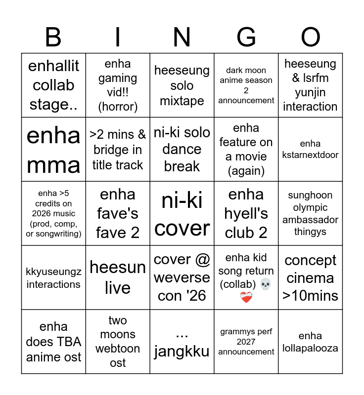 This bingo card has a free space and 24 words: heesun live, two moons webtoon ost, ni-ki solo dance break, enha does TBA anime ost, heeseung & lsrfm yunjin interaction, enhallit collab stage.., enha mma, enha gaming vid!! (horror), enha hyell's club 2, cover @ weverse con '26, enha feature on a movie (again), enha >5 credits on 2026 music (prod, comp, or songwriting), enha kid song return (collab) 💀❤️🩹, concept cinema >10mins, >2 mins & bridge in title track, grammys perf 2027 announcement, sunghoon olympic ambassador thingys, heeseung solo mixtape, enha kstarnextdoor, enha fave's fave 2, enha lollapalooza, kkyuseungz interactions, dark moon anime season 2 announcement and ... jangkku.