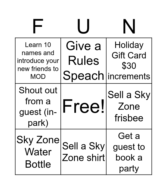 This bingo card has a free space and 14 words: 10 for 8 Pass, Holiday gift card $30 increments, Sky Zone Water Bottle, Give a Rules Speach, Shout out from a guest (in-park), Get a guest to book a party, Facebook shoutout, Name mentioned in guest survey, Sell a Sky Zone shirt, Learn 10 names and introduce your new friends to MOD, Pass out 10 Sky Zone bracelets, Sell a Sky Zone frisbee, Holiday Gift Card $30 increments and 10 for 8 Pass.