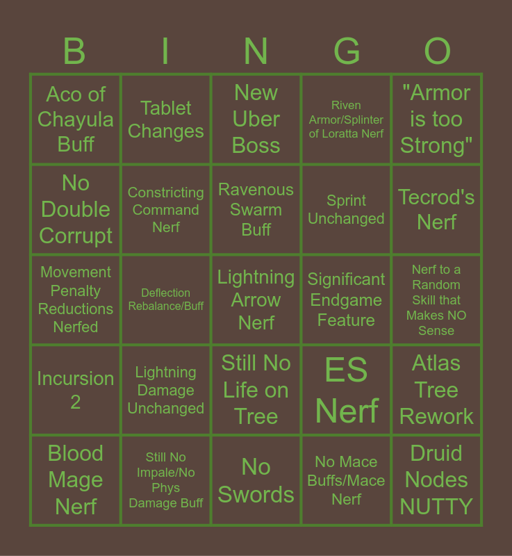 This bingo card has a free space and 29 words: Blood Mage Nerf, Crossbow Buffs, Deflection Rebalance/Buff, Broken Talisman Skill(s), Aco of Chayula Buff, New Uber Boss, Constricting Command Nerf, Lightning Damage Unchanged, Significant Endgame Feature, Still No Impale/No Phys Damage Buff, Nerf to a Random Skill that Makes NO Sense, Druid Nodes NUTTY, No Swords, No Mace Buffs/Mace Nerf, Tecrod's Nerf, No New Acts, Still No Life on Tree, Incursion 2, "Armor is too Strong", Movement Penalty Reductions Nerfed, ES Nerf, Archon Buff, Sprint Unchanged, No Double Corrupt, Riven Armor/Splinter of Loratta Nerf, Tablet Changes, Atlas Tree Rework, Ravenous Swarm Buff and League Mechanic "Coreable".