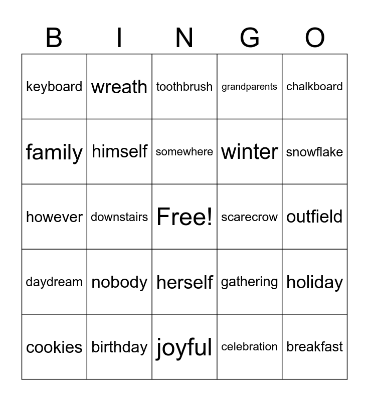 This bingo card has a free space and 40 words: anyone, however, everything, himself, birthday, herself, somewhere, afternoon, chalkboard, daydream, downstairs, grandparents, breakfast, outfield, scarecrow, nobody, dragonfly, keyboard, snowball, toothbrush, holiday, celebration, winter, family, sparkle, decorate, candles, presents, festival, cheer, traditions, cookies, travel, gathering, snowflake, joyful, greeting, music, wreath and parade.