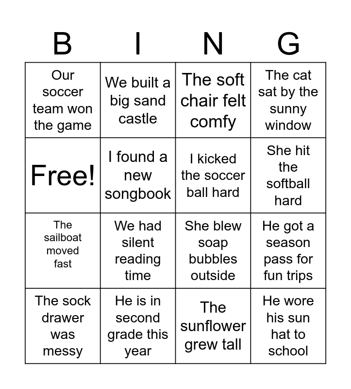 This bingo card has 16 words: He is in second grade this year, He got a season pass for fun trips, The soft chair felt comfy, Our soccer team won the game, The sailboat moved fast, We built a big sand castle, She blew soap bubbles outside, The sunflower grew tall, Free!, I found a new songbook, The sock drawer was messy, The cat sat by the sunny window, We had silent reading time, She hit the softball hard, I kicked the soccer ball hard and He wore his sun hat to school.