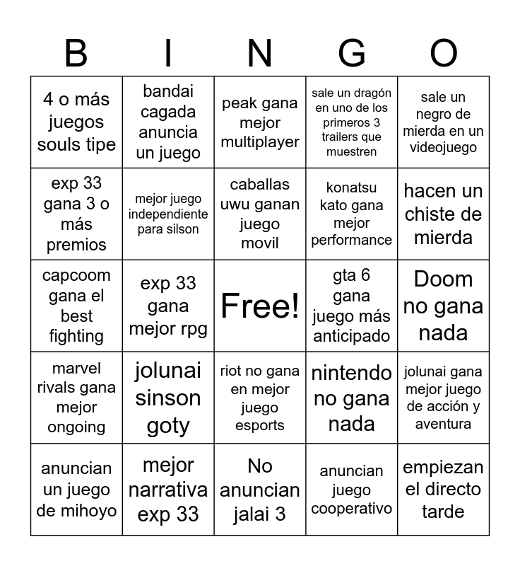This bingo card has a free space and 24 words: jolunai sinson goty, mejor narrativa exp 33, caballas uwu ganan juego movil, anuncian un juego de mihoyo, sale un negro de mierda en un videojuego, 4 o más juegos souls tipe, exp 33 gana 3 o más premios, bandai cagada anuncia un juego, gta 6 gana juego más anticipado, riot no gana en mejor juego esports, konatsu kato gana mejor performance, capcoom gana el best fighting, nintendo no gana nada, jolunai gana mejor juego de acción y aventura, mejor juego independiente para silson, anuncian juego cooperativo, Doom no gana nada, peak gana mejor multiplayer, hacen un chiste de mierda, exp 33 gana mejor rpg, empiezan el directo tarde, marvel rivals gana mejor ongoing, sale un dragón en uno de los primeros 3 trailers que muestren and No anuncian jalai 3.