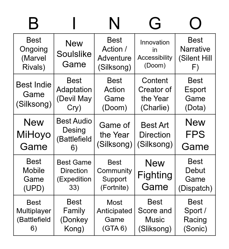 This bingo card has a free space and 24 words: Best Game Direction (Expedition 33), Best Family (Donkey Kong), Best Action Game (Doom), Best Multiplayer (Battlefield 6), Best Narrative (Silent Hill F), Best Ongoing (Marvel Rivals), Best Indie Game (Silksong), New Soulslike Game, Best Art Direction (Silksong), Best Community Support (Fortnite), Content Creator of the Year (Charlie), New MiHoyo Game, New Fighting Game, Best Debut Game (Dispatch), Best Adaptation (Devil May Cry), Best Score and Music (Sliksong), New FPS Game, Best Action / Adventure (Silksong), Best Esport Game (Dota), Best Audio Desing (Battlefield 6), Best Sport / Racing (Sonic), Best Mobile Game (UPD), Innovation in Accessibility (Doom) and Most Anticipated Game (GTA 6).