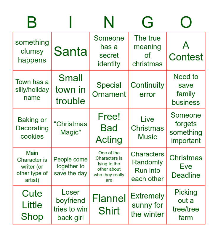 This bingo card has a free space and 81 words: Drinking Coffee/Coco, an "Almost Kiss", Someone has a secret identity, New York, Drone Footage of random small town, Ugly Christmas Sweater, Reference to how different the small town is, Ice Skating, Sledding, Town Sheriff/Town Doctor, House they definitely can't afford, Someone misunderstands situation, The true meaning of christmas, something clumsy happens, Characters share holiday memories, Town has a silly/holiday name, Someone doesn't have enough money to do something, People come together to save the day, Town tree lighting/holiday festival, Someone forgets something important, Characters seeing each other dressed up, A Contest, Baking or Decorating cookies, Special Ornament, Small town in trouble, Car Trouble, Snowstorm Causes Delay, In need of a Miracle, Someone doesn't like Christmas, Child talks like Adult, Need to save family business, Caroling, Flannel Shirt, Wrapping presents, Cute Little Shop, Live Christmas Music, Sitting around a fire, Snowball Fight, Dead parent(s), Sleigh or Carriage ride, Picking out a tree/tree farm, Snows on Christmas, Character with Christmas name, Former love interest, "Christmas Magic", "It's Snowing!", Santa, Airport Scene, Family Recipe, Christmas Shopping, Characters Randomly Run into each other, Christmas Eve Deadline, Workaholic or sworn off love, Someone has a dog, Characters have a big argument, Mistletoe, Awkward Moment, Special Family Tradition, Minor lnjury /Accidental Fall, Building a Snowman or Snow Angels, One of the Characters is lying to the other about who they really are, "I love you" right after meeting each other, Christmas Wish, Movie Ends with Kiss, "You didn't have to get me anything", Bad Writing, Gossipy Best Friend (Matchmaker Best Friend), Relative or Friend Needs help, Decorating Christmas Tree, Leading man drives a truck, Hallmark Product Placement, Main Character is writer (or other type of artist), Loser boyfriend tries to win back girl, Girl is dating a loser, Wise elderly person gives advice, Gingerbread House, A big promotion, Extremely sunny for the winter, "We don't have that here", Continuity error and Wine or Alcohol.