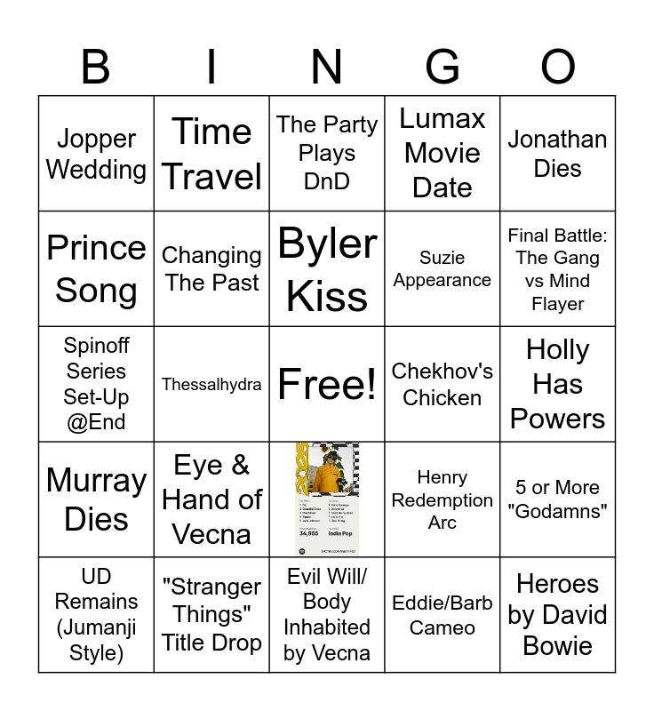 This bingo card has 1 images, a free space and 25 words: Eddie/Barb Cameo, Byler Kiss, "Stranger Things" Title Drop, Jonathan Dies, Jopper Wedding, Prince Song, Time Travel, Holly Has Powers, Henry Redemption Arc, Suzie Appearance, Spinoff Series Set-Up @End, 5 or More "Godamns", UD Remains (Jumanji Style), Thessalhydra, Rockie Hard Launch to Friends, Lumax Movie Date, Murray Dies, The Party Plays DnD, Heroes by David Bowie, Final Battle: The Gang vs Mind Flayer, Evil Will/ Body Inhabited by Vecna, Chekhov's Chicken, Eye & Hand of Vecna, Changing The Past and Dynamite the Wall.