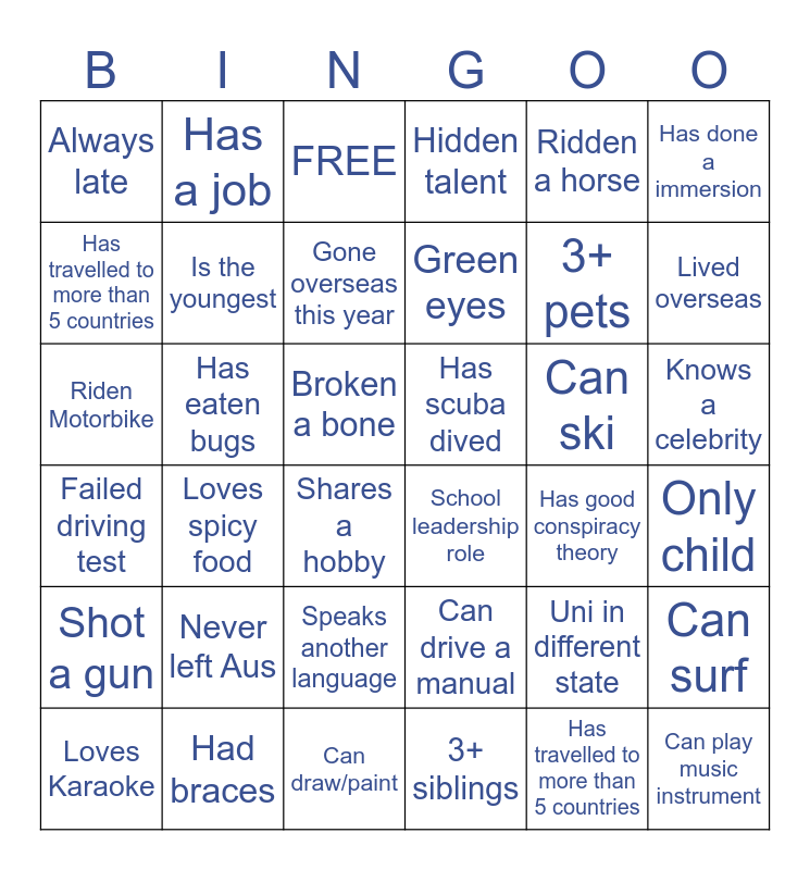 This bingo card has 38 words: Failed driving test, Never left Aus, Can draw/paint, Green eyes, Can ski, Knows a celebrity, Always late, Had braces, Gone overseas this year, Has scuba dived, 3+ pets, Lived overseas, Riden Motorbike, Is the youngest, Broken a bone, School leadership role, Uni in different state, Has done a immersion, Shot a gun, Has a job, FREE, Can drive a manual, Ridden a horse, Can surf, Loves Karaoke, Loves spicy food, Speaks another language, 3+ siblings, Has travelled to more than 5 countries, Can play music instrument, Has paraglided /skydived, Has eaten bugs, Shares a hobby, Hidden talent, Has good conspiracy theory, Only child, Has travelled to more than 5 countries and more than 3 siblings.