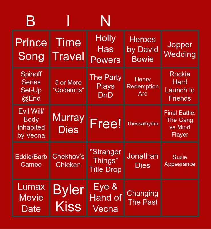 This bingo card has a free space and 24 words: Eddie/Barb Cameo, Byler Kiss, "Stranger Things" Title Drop, Jonathan Dies, Jopper Wedding, Prince Song, Time Travel, Holly Has Powers, Henry Redemption Arc, Suzie Appearance, Spinoff Series Set-Up @End, 5 or More "Godamns", UD Remains (Jumanji Style), Thessalhydra, Rockie Hard Launch to Friends, Lumax Movie Date, Murray Dies, The Party Plays DnD, Heroes by David Bowie, Final Battle: The Gang vs Mind Flayer, Evil Will/ Body Inhabited by Vecna, Chekhov's Chicken, Eye & Hand of Vecna and Changing The Past.